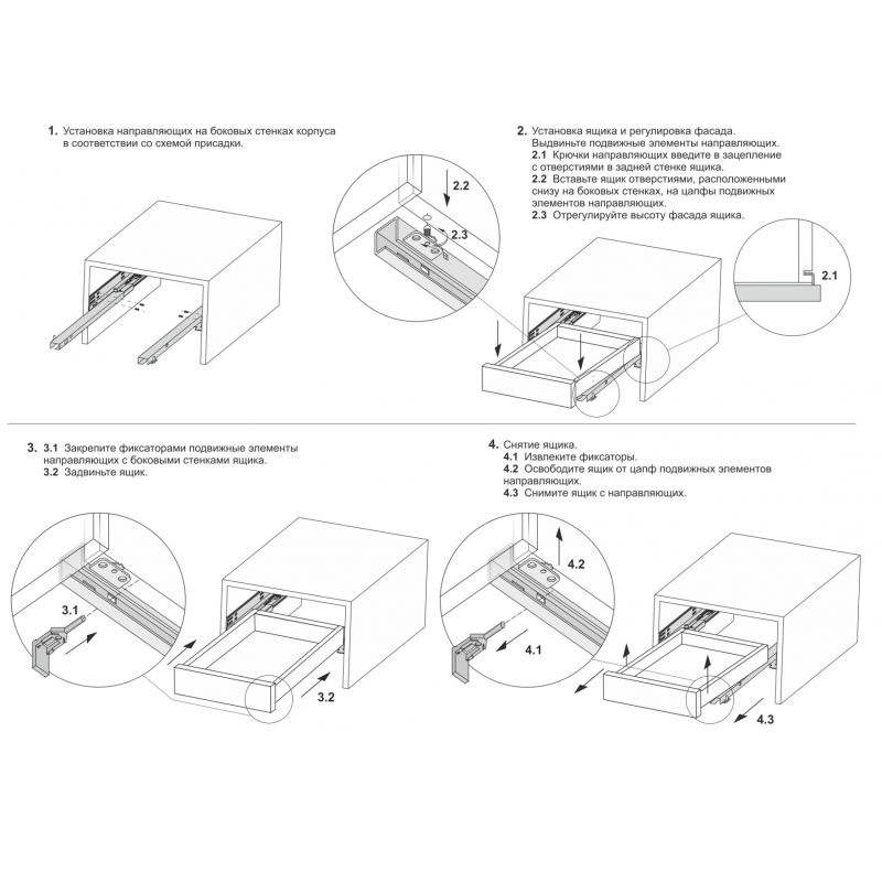 Принцип насадного монтажа также прост, как у надвижного монтажа: мебельный ящик под небольшим наклоном ставится днищем на выдвинутые подвижные части направляющих, так чтобы крючки, расположенные на торцах подвижных частей зашли в отверстия на задней стенке мебельного ящика. После этого, отпуская фасад вниз, отверстиями в боковинах насаживаем переднюю часть мебельного ящика на специальные металлические стержни – цапфы. Завершается монтаж вручную - фиксацией положения ящика на направляющих пластиковыми шпильками. Для демонтажа выдвижной ящик выдвигается до упора, извлекаются пластиковые шпильки, ящик слегка приподнимается, освобождаясь от цапф, и легко снимается. Мебельный ящик крепится на направляющих благодаря пластиковым шпилькам и металлическим цапфам, а регулировка фасада ящика по высоте настраивается с помощью резьбовой регулировки на цапфе.