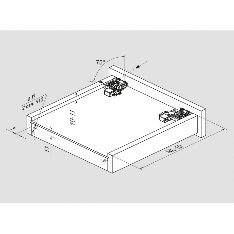 Надвижного монтаж – это стандартный вид монтажа не требующий сверления дополнительных отверстий в боковинах мебельного ящика. Монтаж прост в реализации: ящик в горизонтальном положении днищем устанавливается на выдвинутые части направляющих и задвигается внутрь. Фиксаторы, прикрученные снизу на днище ящика слева и справа около фасада, автоматически надежно зафиксируют мебельный ящик на направляющих в паре с задними крючками, расположенными на торцах подвижных частей направляющих. Столь же легок демонтаж ящика, осуществляемый после простого нажатия на ручки левого и правого фиксаторов. При демонтаже сохраняется установленная высота отрегулированного фасада. Регулировка фасада по высоте, встроенная в фиксатор, обеспечивает фиксированную регулировку фасада мебельного ящика по высоте без использования инструмента.