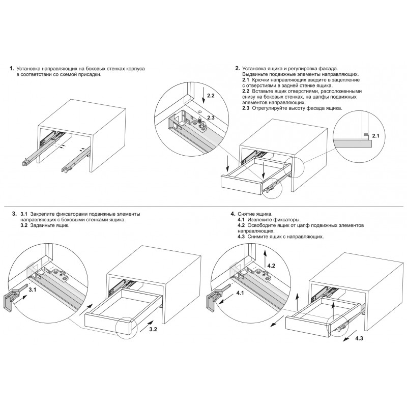 DB4463 – soft-closing (плавное закрывание) – это направляющие скрытого монтажа полного выдвижения, установка мебельного ящика на которых осуществляется при помощи насадного монтажа, то есть креплением на цапфу.