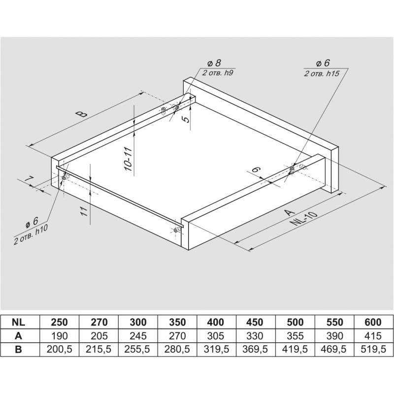 Насадной монтаж или крепление на цапфу – это альтернативный вид монтажа направляющих DB Компании BOYARD, который предполагает сверление дополнительных отверстий в боковинах мебельного ящика. Установка ящика происходит под небольшим углом сверху на заранее выдвинутые части направляющих.