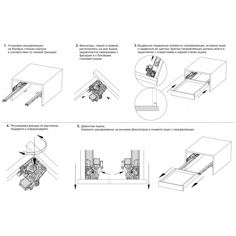 Надвижной монтаж – это стандартный вид монтажа не требующий сверления дополнительных отверстий в боковинах мебельного ящика. Монтаж прост в реализации: ящик в горизонтальном положении днищем устанавливается на выдвинутые части направляющих и задвигается внутрь. Фиксаторы, прикрученные снизу на днище ящика слева и справа около фасада, автоматически надежно зафиксируют мебельный ящик на направляющих в паре с задними крючками, расположенными на торцах подвижных частей направляющих. Столь же легок демонтаж ящика, осуществляемый после простого нажатия на ручки левого и правого фиксаторов. При демонтаже сохраняется установленная высота отрегулированного фасада. Регулировка фасада по высоте, встроенная в фиксатор, обеспечивает фиксированную регулировку фасада мебельного ящика по высоте без использования инструмента.