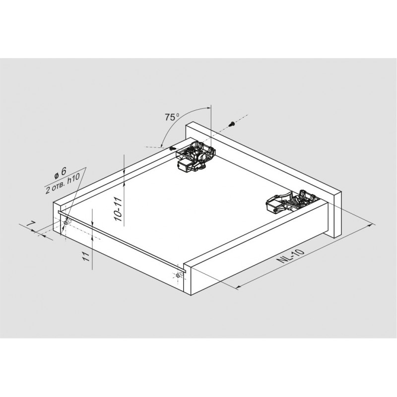 Надвижной монтаж – это стандартный вид монтажа не требующий сверления дополнительных отверстий в боковинах мебельного ящика. Монтаж прост в реализации: ящик в горизонтальном положении днищем устанавливается на выдвинутые части направляющих и задвигается внутрь. Фиксаторы, прикрученные снизу на днище ящика слева и справа около фасада, автоматически надежно зафиксируют мебельный ящик на направляющих в паре с задними крючками, расположенными на торцах подвижных частей направляющих. Столь же легок демонтаж ящика, осуществляемый после простого нажатия на ручки левого и правого фиксаторов. При демонтаже сохраняется установленная высота отрегулированного фасада. Регулировка фасада по высоте, встроенная в фиксатор, обеспечивает фиксированную регулировку фасада мебельного ящика по высоте без использования инструмента.