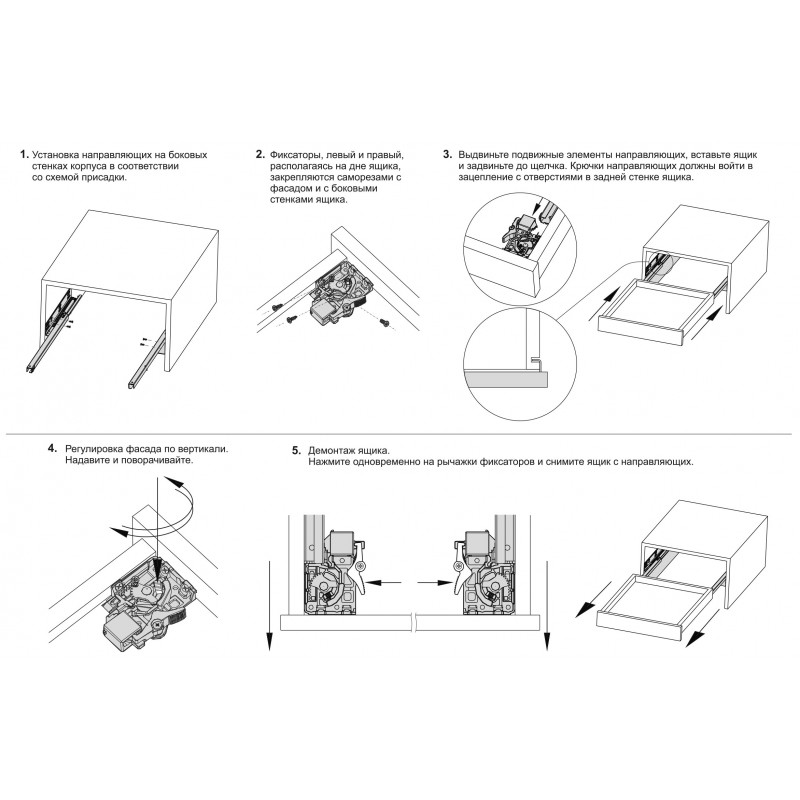 Надвижной монтаж – это стандартный вид монтажа не требующий сверления дополнительных отверстий в боковинах мебельного ящика. Монтаж прост в реализации: ящик в горизонтальном положении днищем устанавливается на выдвинутые части направляющих и задвигается внутрь. Фиксаторы, прикрученные снизу на днище ящика слева и справа около фасада, автоматически надежно зафиксируют мебельный ящик на направляющих в паре с задними крючками, расположенными на торцах подвижных частей направляющих. Столь же легок демонтаж ящика, осуществляемый после простого нажатия на ручки левого и правого фиксаторов. При демонтаже сохраняется установленная высота отрегулированного фасада. Регулировка фасада по высоте, встроенная в фиксатор, обеспечивает фиксированную регулировку фасада мебельного ящика по высоте без использования инструмента.