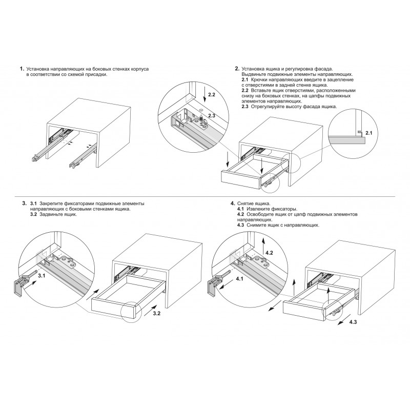 Принцип насадного монтажа также несложен, как у надвижного монтажа: мебельный ящик под небольшим наклоном ставится днищем на выдвинутые подвижные части направляющих, так чтобы крючки, расположенные на торцах подвижных частей зашли в отверстия на задней стенке мебельного ящика. После этого, отпуская фасад вниз, отверстиями в боковинах насаживаем переднюю часть мебельного ящика на специальные металлические стержни – цапфы. Завершается монтаж вручную - фиксацией положения ящика на направляющих пластиковыми шпильками. Для демонтажа выдвижной ящик выдвигается до упора, извлекаются пластиковые шпильки, ящик слегка приподнимается, освобождаясь от цапф, и легко снимается. Мебельный ящик крепится на направляющих благодаря пластиковым шпилькам и металлическим цапфам, а регулировка фасада ящика по высоте настраивается с помощью резьбовой регулировки на цапфе.