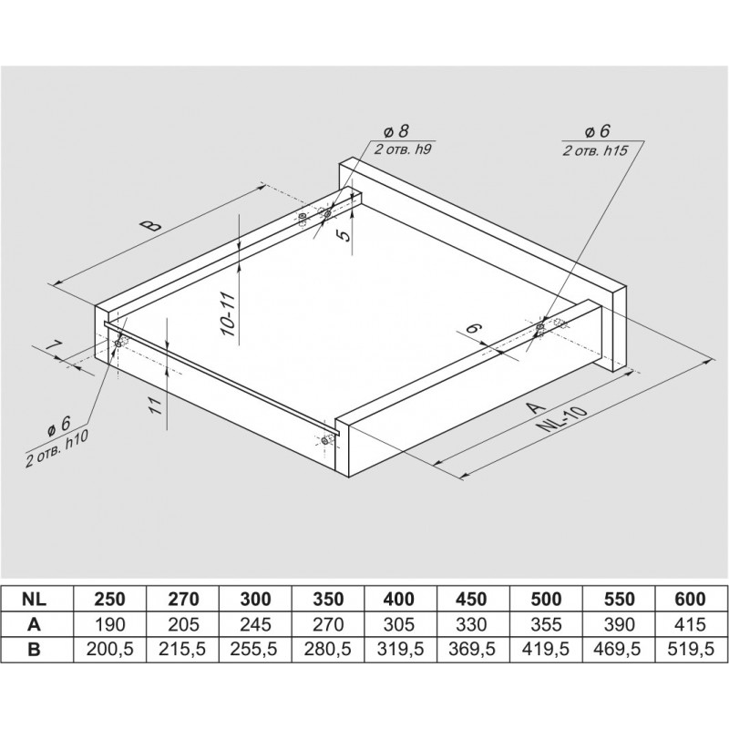 Насадной монтаж или крепление на цапфу – это альтернативный вид монтажа направляющих DB Компании BOYARD, который предполагает сверление дополнительных отверстий в боковинах мебельного ящика. Установка ящика происходит под небольшим углом сверху на заранее выдвинутые части направляющих.