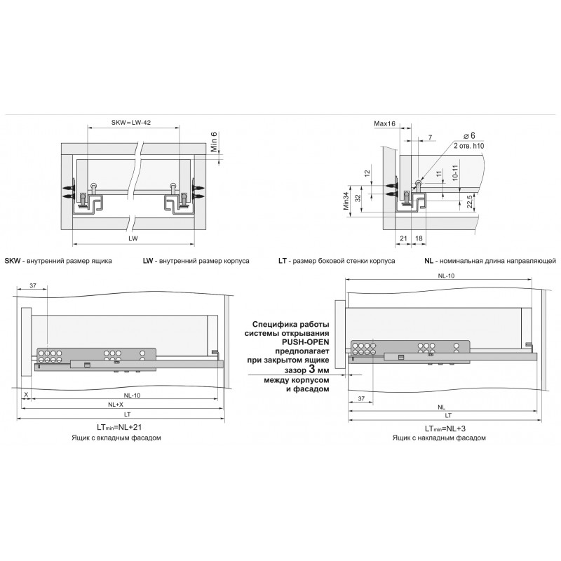 Основное отличие монтажа направляющих DB - push-to-open (выдвижение после нажатия) от аналогичных направляющих DB soft-closing (плавное закрывание) в том, что в закрытом положении между фасадом мебельного ящика и корпусом шкафа остается небольшой зазор для возможности нажатия в соответствии с особенностями опции открывания «в одно прикосновение».