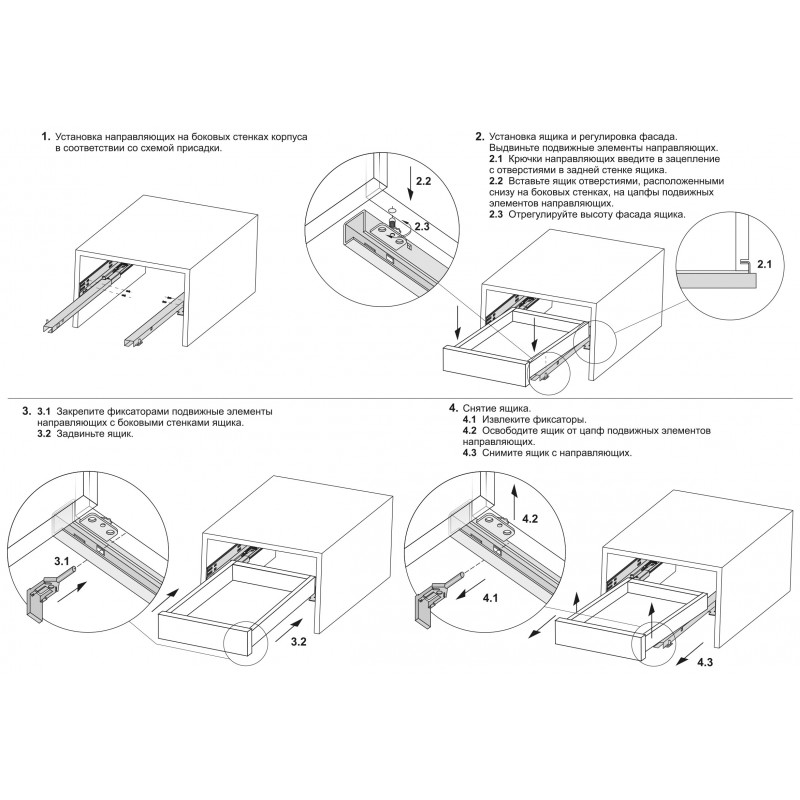 Принцип насадного монтажа также несложен, как у надвижного монтажа: мебельный ящик под небольшим наклоном ставится днищем на выдвинутые подвижные части направляющих, так чтобы крючки, расположенные на торцах подвижных частей зашли в отверстия на задней стенке мебельного ящика. После этого, отпуская фасад вниз, отверстиями в боковинах насаживаем переднюю часть мебельного ящика на специальные металлические стержни – цапфы. Завершается монтаж вручную - фиксацией положения ящика на направляющих пластиковыми шпильками. Для демонтажа выдвижной ящик выдвигается до упора, извлекаются пластиковые шпильки, ящик слегка приподнимается, освобождаясь от цапф, и легко снимается. Мебельный ящик крепится на направляющих благодаря пластиковым шпилькам и металлическим цапфам, а регулировка фасада ящика по высоте настраивается с помощью резьбовой регулировки на цапфе.