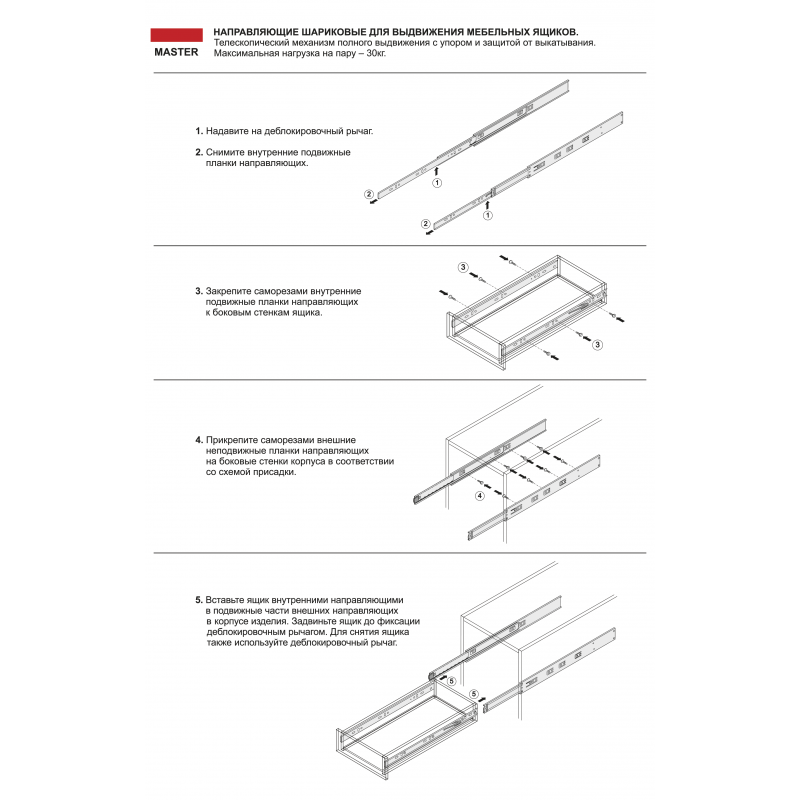 Master DB4504 – шариковые направляющие полного выдвижения без амортизации, выполненные по европейскому стандарту. Это надежный партнер мебельщика в производстве добротной мебели сегмента «средний» и «средний+». Master DB4504 обладает современными характеристиками и обеспечивает стабильную работу ящиков и плавный, равномерный ход, сравнимый по комфорту с движением современных систем выдвижения. Модель надежна и долговечна – она обладает оптимальной грузоподъемностью 30 кг и гарантирует бесперебойную работу направляющей на протяжении более 50 000 циклов открывания/закрывания.