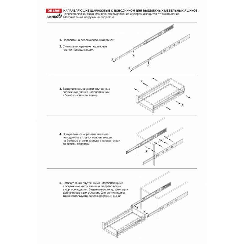 Satellite DB4505 – шариковые направляющие с амортизацией европейского стандарта. Satellite, как надежный спутник любой мебели, обладает современными характеристиками. Модель обеспечивает равномерный, бесшумный и стабильный ход и мягкое деликатное закрывание. По комфорту движения Satellite можно сравнить с системами выдвижения нового поколения (скрытого монтажа, B-box). Модель надежна и долговечна – она обладает оптимальной грузоподъемностью 35 кг и гарантирует бесперебойную работу механизма на протяжении более 50 000 циклов открывания/закрывания. Функция самопостановки седла механизма доведения в рабочее состояние сделает эксплуатацию максимально легкой и удобной без необходимости демонтажа ящика. Направляющие Satellite обладают максимально возможным для выбранной длины выдвижением. Новинка ориентирована на сегмент средний и средний+, поставляется в индивидуальной упаковке и комплектуется всем необходимым крепежом.