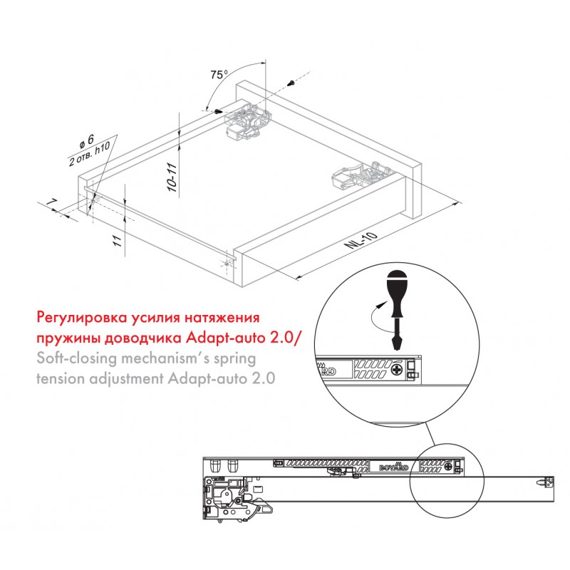 - Adapt-auto — адаптивная регулировка усилия работы доводчика — уникальное технологическое решение BOYARD, которое позволяет легко и быстро «в домашних условиях» ослабить или усилить натяжение пружины доводчика. Опция Adapt-auto незаменима в случае нестандартной нагрузки, когда неглубокий ящик имеет высокий и тяжелый фасад, или же когда груз внутри ящика распределен ближе к фасаду. В случае многолетней активной эксплуатации мебели пружину доводчика можно подтянуть и доводчик будет работать как в день установки направляющих. Усиливать или облегчать натяжение пружины пользователи мебели могут самостоятельно, выставив подходящее положение регулировочного винта в доводчике при помощи обычной крестовой отвертки.