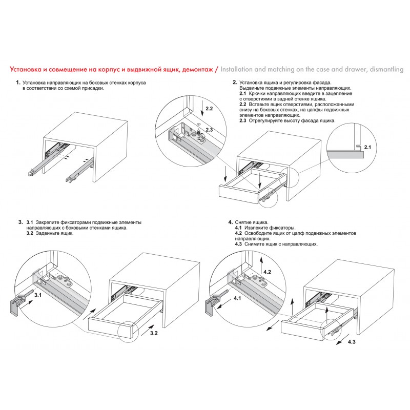 Направляющие скрытого монтажа В-slide предусматривают версию полного и частичного выдвижения. Механизмы с артикулами, заканчивающимися на нечетные цифры DB8881, DB8883 — полного выдвижения. Четные артикулы DB8882, DB8884 говорят о неполном выдвижении.
