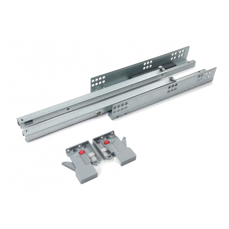 Направляющие скрытого монтажа неполного выдвижения с опцией открывания легким нажатием на фасад (push-to-open), со способом установки мебельного ящика при помощи надвижного монтажа. Отличительная особенность данной системы – особый механизм толкателя, который не повреждается и продолжает корректно функционировать при случайном открытии выдвижного ящика без нажатия на фасад даже после 100 некорректных открываний. Модель обладает возможностью регулировки фасада по вертикали клипсой - +2 мм. Система выдвижения B-Slide DB8886 выдерживает нагрузку в 25кг и гарантирует бесперебойную работу на протяжении 60 000 циклов открывания/закрывания. Раскрой и присадочные размеры идентичны направляющим скрытого монтажа B-Slide DB8882.