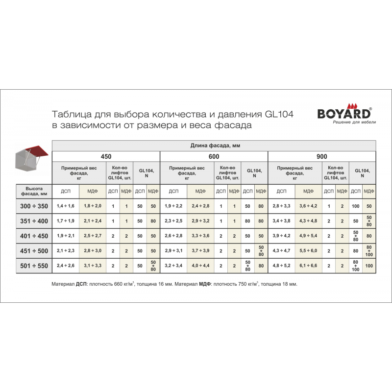BOYARD предлагает газовые лифты для мебели GL104 с возможностью фиксации фасада при открытии в каждой точке траектории движения. Механизмы рассчитаны на 60 000 циклов открывания. Шток нового лифта защищен от возможного попадания пыли и влаги дополнительной алюминиевой трубкой, а обновленная легкосъемная конструкция фиксаторов упрощает процесс монтажа/демонтажа механизмов. Для смягчения закрытия фасада на мебельных петлях без амортизации можно использовать упор-защелки AMF.