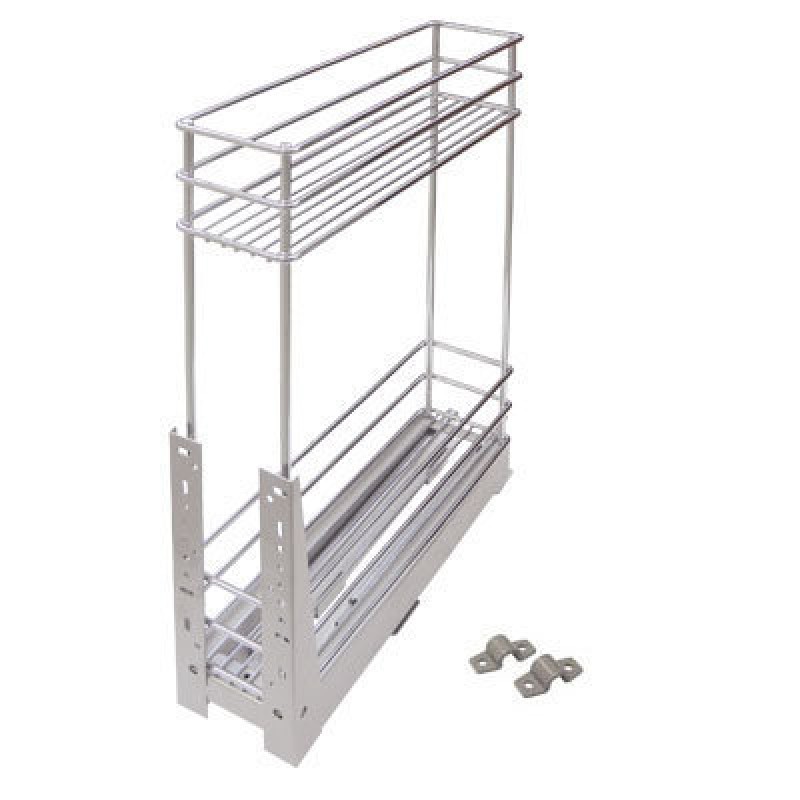 Выдвижная корзина шириной 150 мм предназначена для заполнения узких ниш в кухонных шкафах, тумбах или колоннах. Внутреннее пространство корзины узкое и высокое, что делает возможным ее использование в роли бутылочницы: на нижней полке прекрасно поместятся бутылки разной высоты, а верхняя полка послужит хранилищем для невысоких бутылочек, сосудов, аксессуаров, необходимых в кухонном быту мелочей. Неширокая, корзина может быть установлена рядом с другими выдвижными сетчатыми решениями. Размещенная в зоне мойки, конструкция станет вместилищем набора чистящих и моющих средств, а также аксессуаров для уборки.