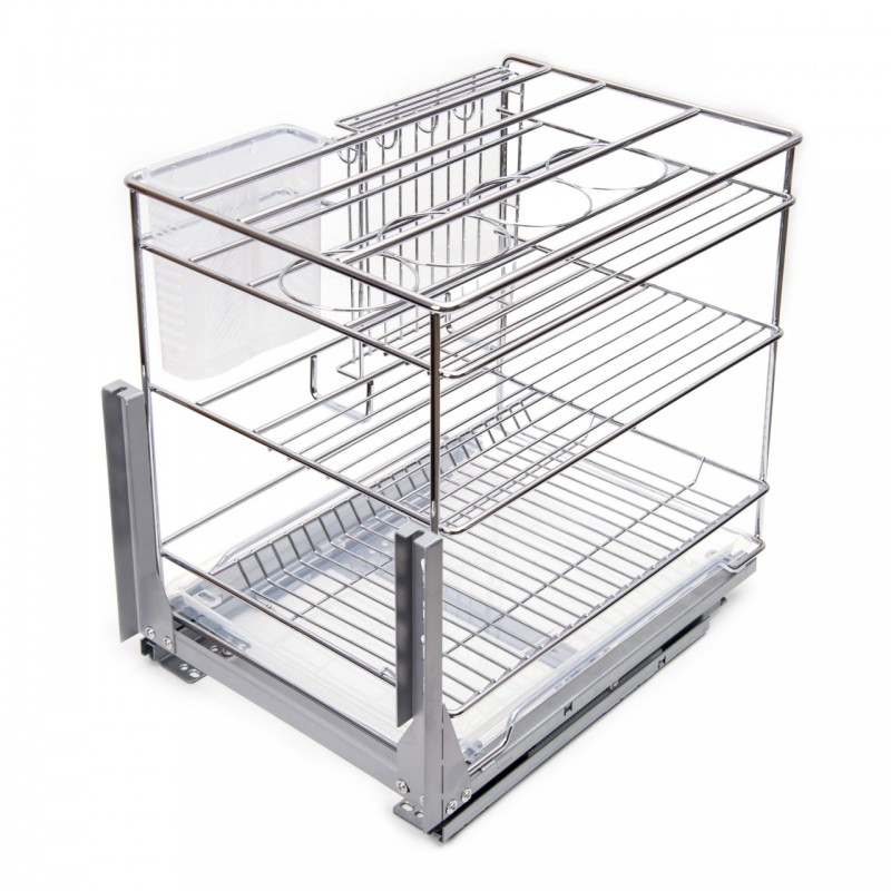 Трехуровневая вместительная выдвижная корзина представляет собой функциональную систему для рационального хранения продуктов и кухонных аксессуаров. Это многоцелевое сетчатое решение может успешно занимать свое место практически в любой кухонной зоне: в обеденной, в зоне хранения припасов или приготовления пищи. Объемная корзина займет нижний модуль гарнитура или тумбу. В строении корзины для эргономичной организации хранения уже предусмотрены удобные разделители, пластиковый контейнер и крючки для навешивания полотенец, прихваток, тканевых салфеток и прочих атрибутов уютного быта. На нижнем уровне можно хранить значительное количество продуктов или посуды. Средний уровень имеет проволочные круглые ограничители – для удобного и безопасного размещения крупных банок или толстых бутылей. На третьем уровне находится универсальный контейнер и ряд крючков для навешивания. Предусмотренные навесные и встроенные элементы этой корзины позволяют максимально упорядочить хранение продуктов и необходимых на кухне предметов. Для любой хозяйки такая умная выдвижная система станет настоящим открытием и удачным решением для эргономичного быта. Корзина имеет актуальное цветовое покрытие – полированный хром, с которым прекрасно сочетается серый цвет крепления. Лаконичный дизайн корзины и аксессуаров позволяет соблюсти и продолжить стиль и изящество интерьера во внутреннем пространстве шкафа. В комплекте с корзиной поставляется весь необходимый крепеж и поддон.