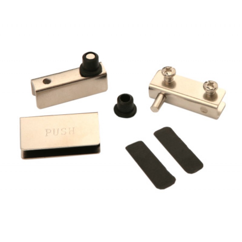 Петли для стекла HG001 толщиной до 6мм. Устанавливаются без сверления отверстия в стекле. Сверлятся не сквозные отверстия (d7х8мм) для втулок в верхней и нижней плоскостях шкафа. Затем в отверстия вставляют втулки, петли. Устанавливают стекло в петли, фиксируют его винтами, а к дверце крепят накладку. Рекомендуется использование совместно с магнитными держателями. Комплект предназначен для одного стеклянного фасада.