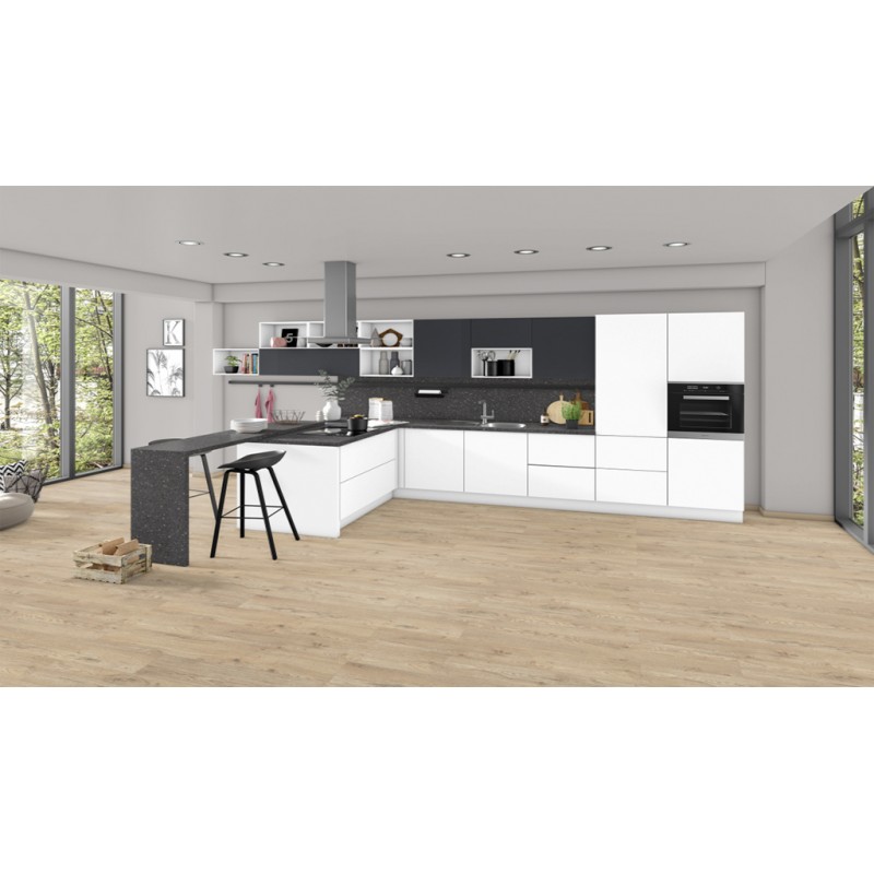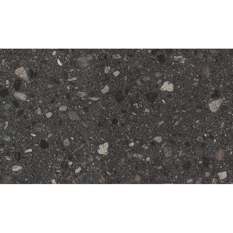 В соответствии с тенденцией к использованию имитаций терраццо была создана выразительная репродукция камня Камень Вентура чёрный. Модными являются комбинации с чёрными однотонными или древесными декорами. Со светлыми классическими древесными репродукциями декор столешниц создаёт современный контраст. Благодаря разноцветным камням в рисунке декора он особенно хорошо гармонирует также с пастельными цветами разных оттенков. Структура ST76 Минерал шероховатый матовый придаёт декору рельефность, на ощупь напоминающую шероховатую поверхность камня.