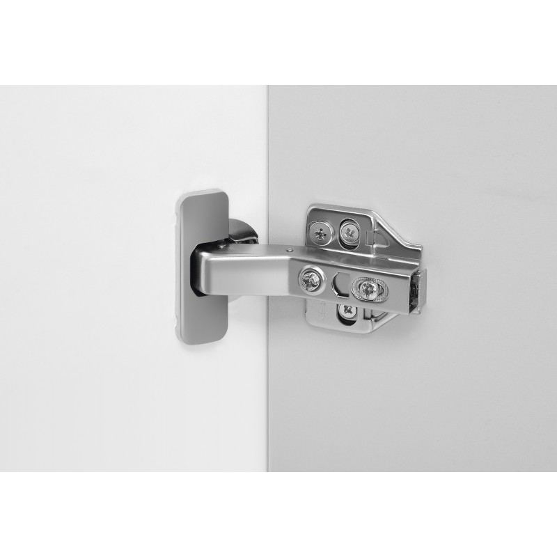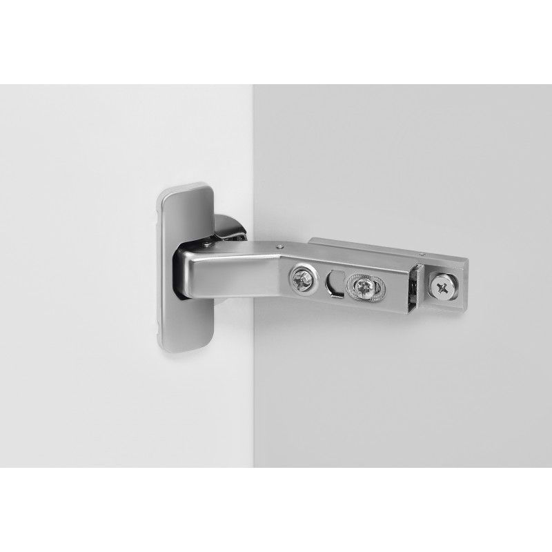 Н642 + Н3010 – базовая комбинация для установки под углом 135 градусов относительно внутренней поверхности боковой стенки. Это вариант без эксцентриковой регулировки. Скорректировать положение фасада возможно в трех плоскостях. Трапециевидная планка обеспечивает жесткую фиксацию за счет большой площади опорной площадки.