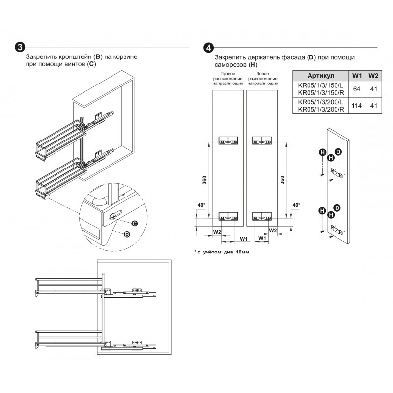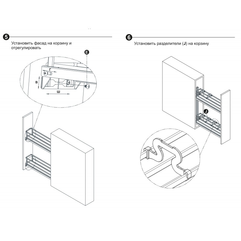 FLORA может быть установлена на левую или правую боковину модуля с помощью направляющих нового поколения с синхронизацией и доводчиком длиной 450 мм, которые обеспечивают легкое, равномерное и бесшумное движение бутылочницы. Система обеспечивают удобную трехмерную регулировку положения фасада.