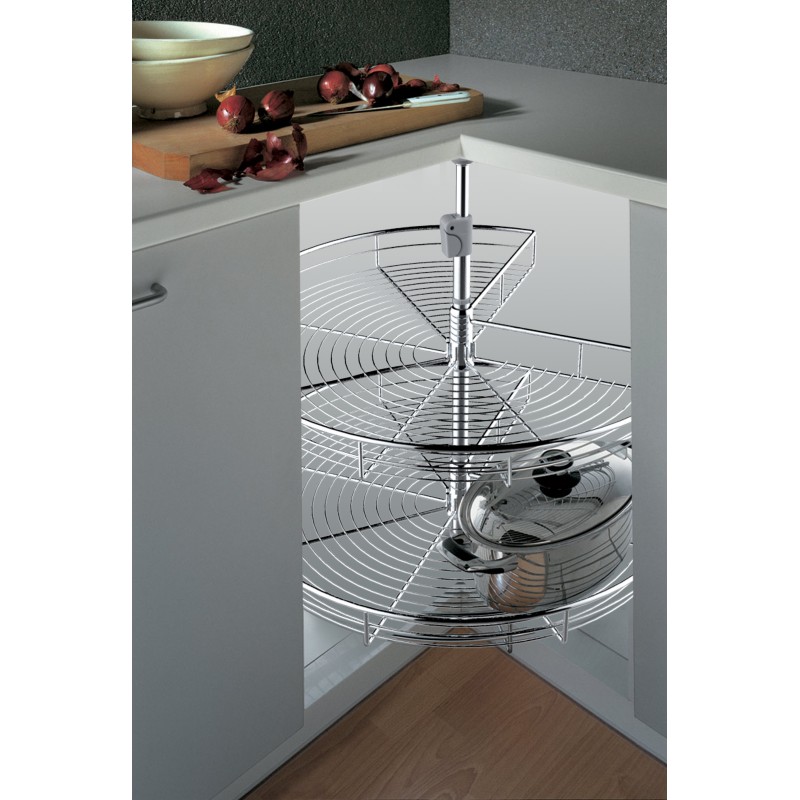 Корзина-карусель RONDO позволяет эффективно использовать сложные угловые пространства на кухне – в угловой тумбе нижнего модуля гарнитура размером 800*800 мм. Благодаря фигурной форме модели – сетки корзины представляют собой неполный круг (3/4) – конструкция удобно входит в мебельный модуль, делая полезным практически всё угловое пространство. Причем карусель RONDO предусматривает не только удобное хранение продуктов, посуды, кастрюль, кухонной утвари или аксессуаров, но и возможность легкого и быстрого доступа к этим предметам, так как сетки корзины вращаются вокруг своей оси. Для удобства пользователя обе сетки корзины можно регулировать по вертикали, определяя необходимую высоту этажей.