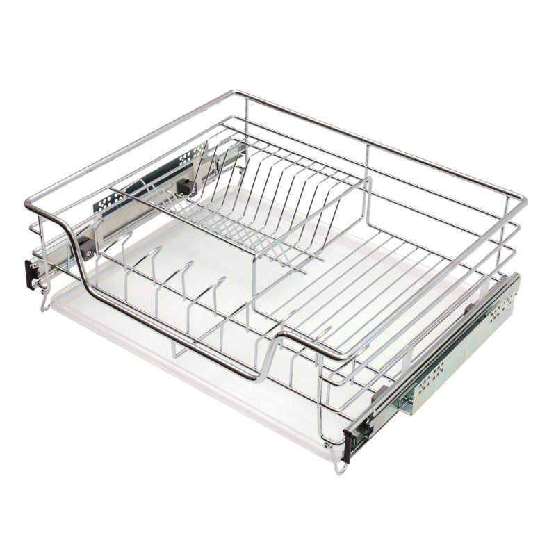Выдвижная корзина-сушка отличается рационально организованным сетчатым пространством. Для удобства пользователя внутренняя площадь корзины оснащена держателями для стаканов и чашек, сеткой для тарелок, также есть свободная зона для «неформатной» посуды – пиал, вазочек, сливочников и т.п. Расположение посуды в этой корзине-сушке продумано с точки зрения эргономики: на первом плане – то, что используется чаще. Но и предметы дальнего плана доступны и удобны для моментального извлечения благодаря механизму полного выдвижения. Корзина-сушка гарантирует постоянный порядок в зоне мойки: каждая тарелочка на своем месте! Конструкция оснащена поддоном для стекания воды. Сетка корзины-сушки изготовлена из хромированной стали. Благодаря высокому качеству материала и покрытия сушки прочны, надежны и долговечны даже в агрессивных условиях кухонной среды. Съемное пластиковое крепление к фасаду достаточно для крепления ящичного фасада к корзине и не слишком обременяет ценой при варианте монтажа за распашными дверками. Пользоваться сушкой не только удобно, но еще и эстетически приятно благодаря лаконичному дизайну стальной конструкции. Корзина-сушка выполнена в цвете полированный хром. Для удобства производителей мебели и пользователей эта модель корзины-сушки представлена в двух популярных размерах: с монтажными длинами 600 мм и 800 мм. Весь необходимый крепеж для быстрого и легкого монтажа имеется в комплекте.