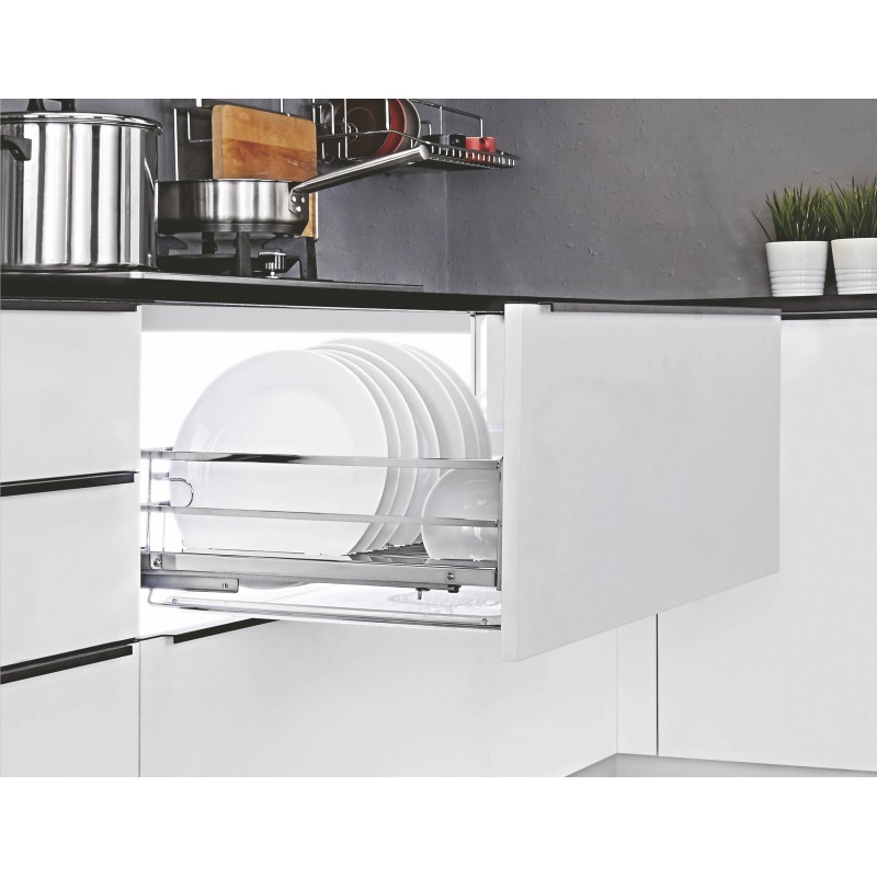 Выдвижная корзина-сушка CARMA обладает стильным европейским дизайном, продуманной организацией хранения и сушки разноплановой посуды. Для каждого блюдца, тарелки или кружки есть свое место – все предметы на виду и под рукой. Они устойчиво располагаются в корзине и не перемещаются внутри, не стукаются и не бьются при движении самой корзины. KRS05 оснащена удобным поддоном из современного экологичного пластика для сбора стекающих с посуды капель. Поддон легко снимается для чистки и мойки. CARMA устанавливается на направляющие нового поколения с синхронизацией и доведением длиной 450 мм. Модель обладает средней грузоподъемностью до 40 кг и предложена в трех вариантах ширины – 600, 800 и 900. Это идеальное решение как для гарнитуров со стандартными, так и с модными широкими модулями.