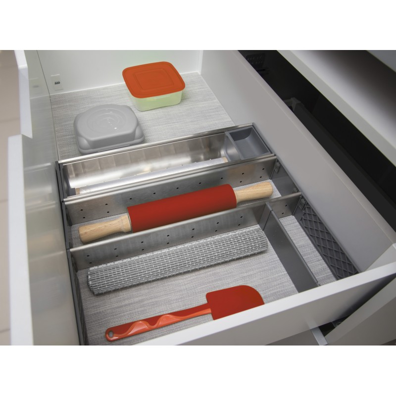 Удобные поддоны-делители из нержавеющей стали для организации внутреннего пространства выдвижных ящиков. Поддоны состоят из нескольких ячеек прямоугольной формы разной ширины. Конфигурация поддонов позволяет обеспечить эргономичное хранение разнообразных предметов: габаритных кухонных принадлежностей (половников, лопаток, пресса для чеснока, закаточной машинки для банок и пр.), инструментов. Поддоны РС06 могут быть дополнением домашней и промышленной мебели, могут размещаться в ящиках как самостоятельно, так и в комплекте с другими поддонами, например с РС04 и РС05. Комбинации из поддонов РС04, РС05, РС06 будут особенно актуальны для широких мебельных модулей.