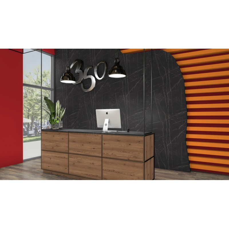 Мрамор популярен не только в белом варианте. Декор Камень Пьетра Гриджиа чёрный имеет выразительный рисунок, позволяющий в особенности за счёт своих белых прожилок создавать чёрно-белые комбинации с белыми декорами во всех структурах или с древесными декорами белых оттенков. В комбинации возможно также создавать яркие цветовые акценты, например с оттенками красного. Эта репродукция мрамора смотрится очень аутентично даже на больших площадях, так как увеличенный раппорт в формате XL редко повторяет рисунок. Структура ST9 Мягкий матовый придаёт поверхности декора соответствующую прохладность и матовость на ощупь.
