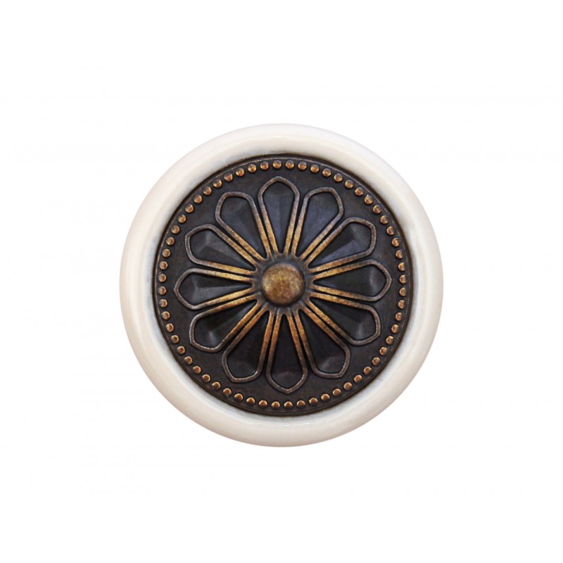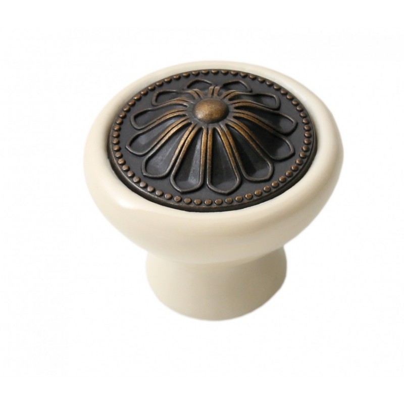 Ручка-кнопка RC107AB.4/W эффектно сочетает разные материалы, фактуры и покрытия: белая керамическая основа декорирована круглой металлической вставкой с цветочным узором в покрытии "старинная латунь". Такое решение делает ручку оригинальной и стильной. В дизайне ручки просматриваются черты эстетики Прованс и средиземноморского стиля, нотки дачной романтики и ненавязчивая винтажная мелодия.