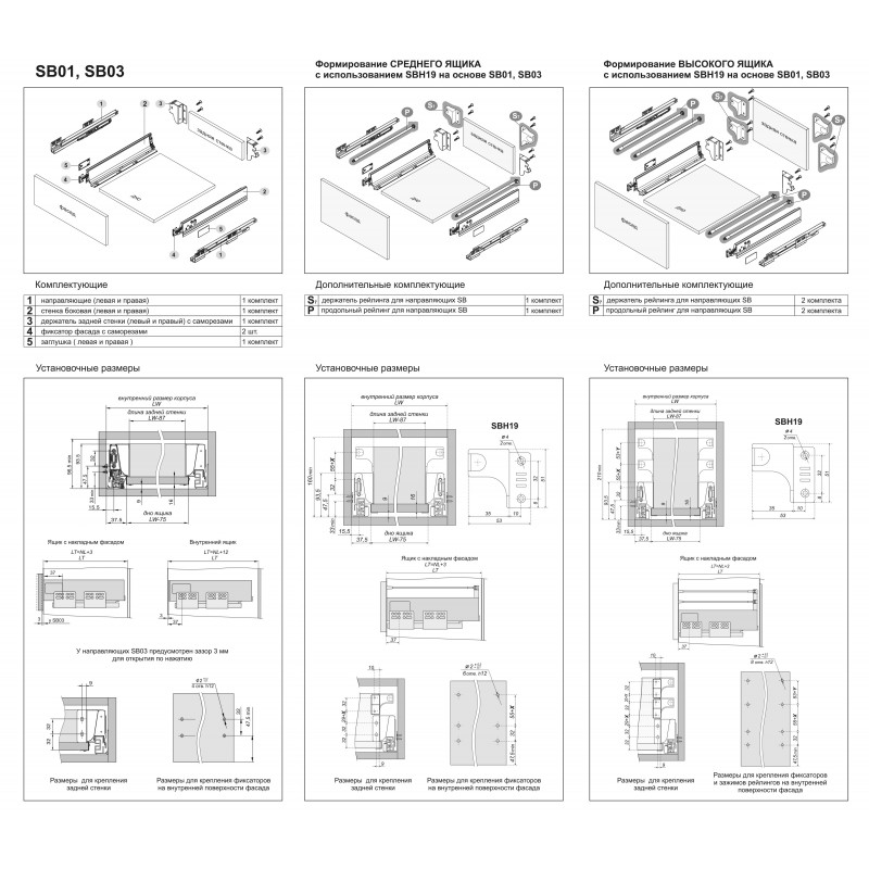 Комплект направляющих SB01 «необходимый минимум» - базовый SB01, включает в себя две металлические боковины, две опорные направляющие и по два держателя для соединения системы направляющих с фасадом и задней стенкой.