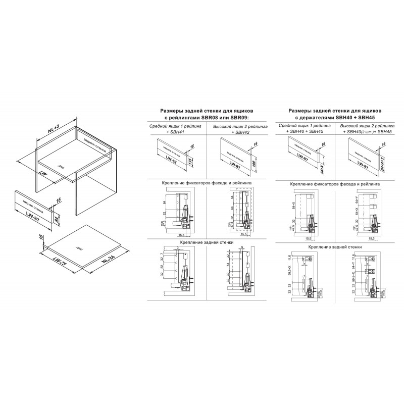 Для сборки выдвижного мебельного ящика с помощью боковых стенок SBDW08 необходимо самостоятельно изготовить фасад, заднюю стенку и дно ящика, изготовленные с учетом собственных пожеланий и потребностей по ширине и высоте готового ящика. Схема раскроя дна выдвижного мебельного ящика соответствует уже зарекомендовавшей себя популярной системе B-BOX SB04 и европейским аналогам.