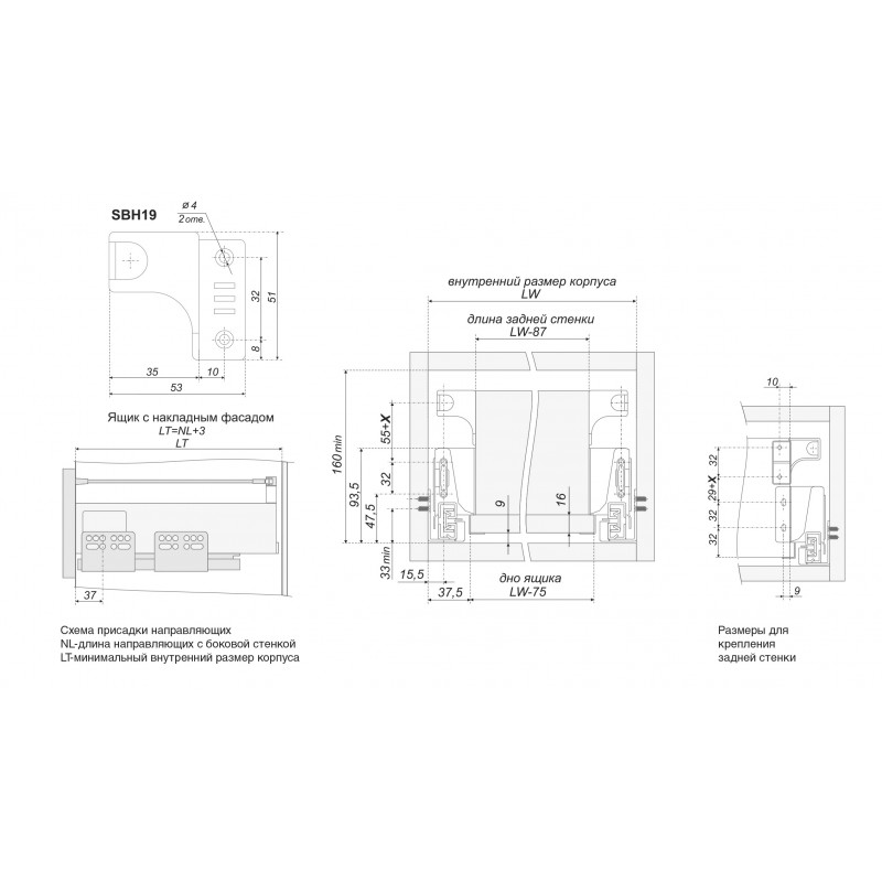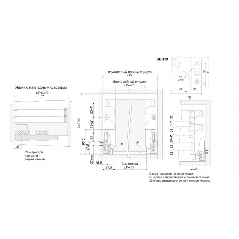 Внимание! Для формирования среднего ящика или высокого ящика на базе стандартного комплекта SB01 необходимо, чтобы высота задней стенки была выше стандартной высоты (84 мм) минимум на 51 мм для возможности установки держателя SBH19.