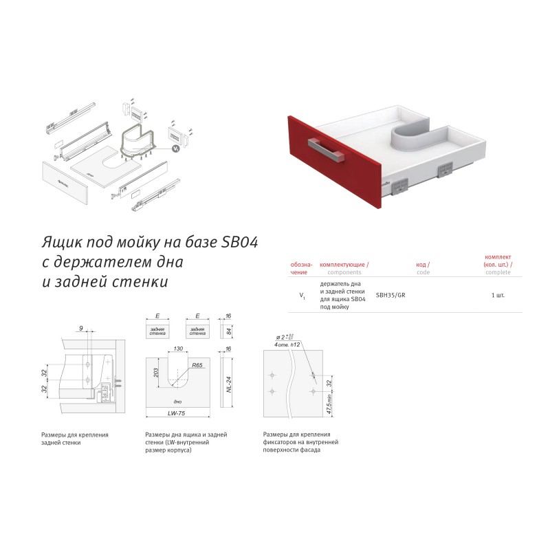 SBH35/GR – держатель дна и задней стенки для выдвижного ящика под мойку, сформированного на базе направляющих B-box. SBH35 предназначен для изготовления ящика под мойку на базе комплекта направляющих B-box. Держатель фиксирует дно и заднюю стенку выдвижного ящика, формируя глубокий удобный и эргономичный выдвижной ящик вокруг смесителя под мойкой. Высота держателя SBH35 соответствует высоте металлической боковины стандартного ящика B-box. Держатель дна и задней стенки SBH35/GR ящика под мойку сделан из прочного и безопасного пластика, что актуально в условиях повышенной влажности пространства под мойкой. Держатель SBH35/GR предложен в нейтральном сером цвете, который отлично сочетается с другими частями выдвижного ящика вокруг мойки.