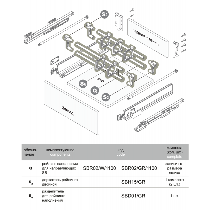 На выбор представлены рейлинги наполнения в белом и сером цвете. Цветовая гамма рейлингов гармонирует с внутренней отделкой ящика и с другой фурнитурой внутреннего наполнения.