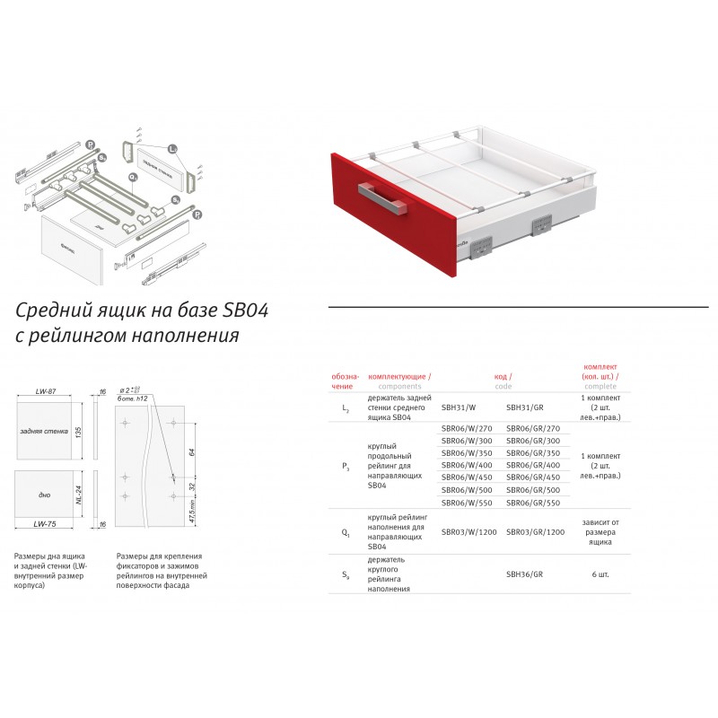 SBR03 – рейлинг наполнения круглый для направляющих B-Box. Предназначен для разделения и упорядочивания внутреннего пространства высоких и средних выдвижных ящиков, сформированных при помощи направляющих B-box. С помощью рейлингов наполнения внутреннее пространство выдвижных ящиков делится на ячейки. Рейлинг наполнения представляет собой металлическую трубу длиной 1200 мм, которую можно нарезать под необходимые размеры. Рейлинг предложен в популярных белом и сером цветах. Материал – прочный и долговечный алюминий.