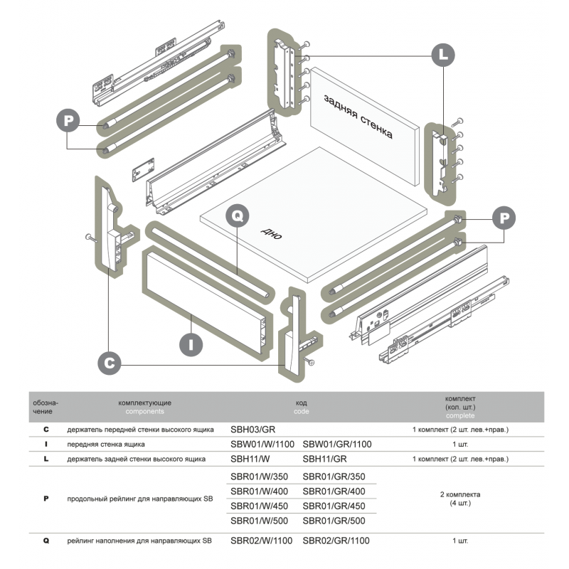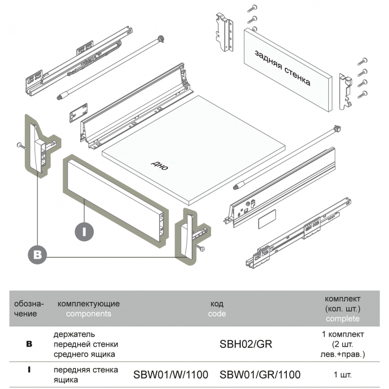 Передняя стенка заменяет фасад стандартного, среднего и высокого внутреннего выдвижного ящика. Исходная длина стенки – 1100 мм – подрезается производителем или сборщиками под необходимый размер ширины ящика. Передняя стенка может быть выполнена в сером или белом цвете. Конструкция стенки предусматривает возможность открывания ящика без мебельных ручек.