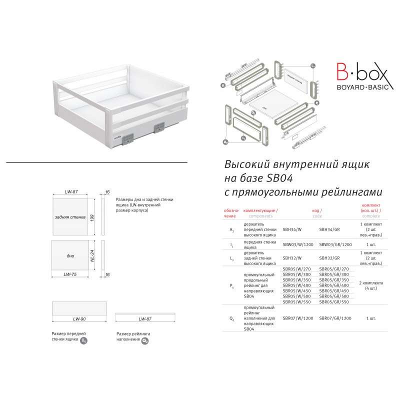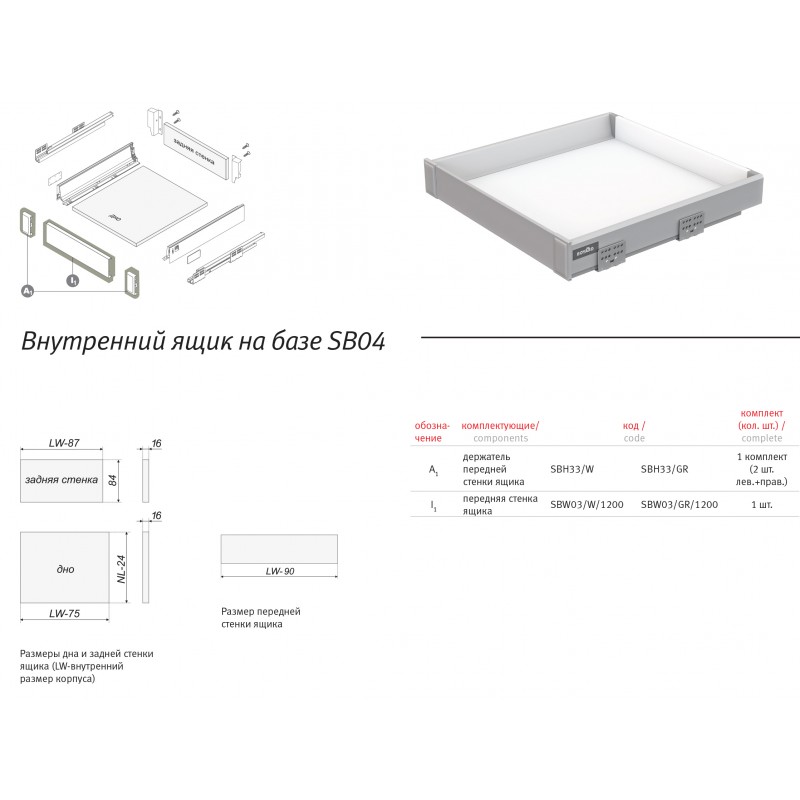 SBW03 – передняя стенка для формирования внутреннего выдвижного ящика, сформированного на базе B-box. Передняя стенка заменяет фасад внутреннего выдвижного ящика. Исходная длина стенки – 1200 мм – позволяет разрезать под необходимую ширину ящика. Стенка предложена в двух актуальных цветах – в белом и сером. SBW03 выполнен из алюминиевого сплава, устойчивого к воздействиям агрессивной среды.