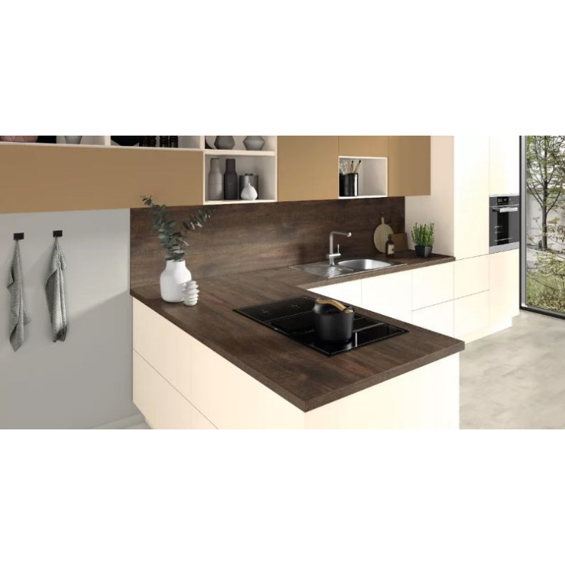 Декор H2409 Дуб Кардифф коричневый является рустикальной репродукцией древесины дуба с имитацией дощатого рисунка. Его темно-коричневый цвет в сочетании черными порами позволяет интересно комбинировать этот декор, используемый для оформления столешниц, с черными акцентными элементами.