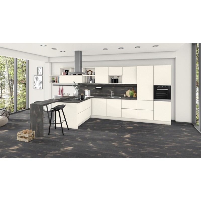 Дуб Хэлфорд чёрный – это очень выразительная, чёрная репродукция дуба, изначально созданная для напольных покрытий. Благодаря своим светлым контрастам за счёт пор и участков с эффектом изношенности этот декор хорошо подходит для корпусов мебели в сочетании со светлыми однотонными фасадами, создавая при этом очень выразительные акценты. Природная естественность репродукции дополнительно подчёркивается за счёт увеличенного раппорта в формате XL, так как благодаря этому на протяжении всего рисунка декора редко встречаются повторения.
