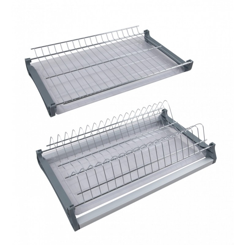 Комплект сушки включает 2 яруса для хранения посуды с надёжным гальваническим покрытием с эффектом хромирования, 2 съёмных поддона из качественного бесцветного пластика, 4 пластиковых серых держателя нижнего и верхнего уровней, переднюю и заднюю алюминиевые трубки, саморезы для монтажа сушки и крепления трубки.