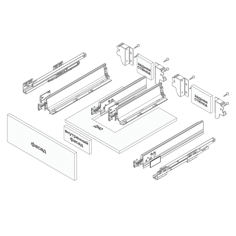 Чтобы сформировать выдвижной ящик П-образной формы под мойку, необходимо взять два комплекта направляющих базовый SB01 или SB03, причем разной номинальной длины: боковины меньшей длины будут расположены ближе к мойке, с левой и правой стороны, а боковины большей длины будут расположены ближе к боковым стенкам тумбы под мойку. Это решение требует дополнительных затрат от производителя на производство дна специальной П-образной формы и внутреннего фасада.