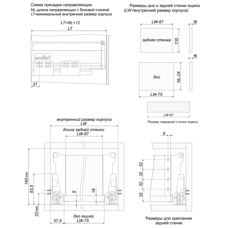 Для формирования комплекта направляющих SB «для внутренних ящиков» необходим комплект направляющих SB01 или SB03 и дополнительные комплектующие: держатель задней стенки для среднего ящика SBH10, продольный рейлинг, алюминиевая передняя стенка SBW01, исходным размером 1100 мм (подрезается под необходимую ширину ящика), и пластиковые держатели SBH02 для соединения системы направляющих с передней стенкой и рейлингами.