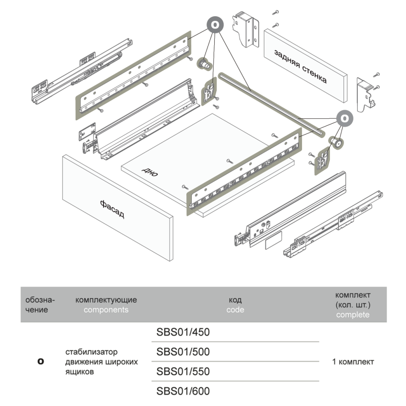Стабилизатор движения широких ящиков сделан из металла в сочетании с высококачественным пластиком и рассчитан на успешную работу весь эксплуатационный срок в условиях значительной нагрузки на выдвижной ящик.