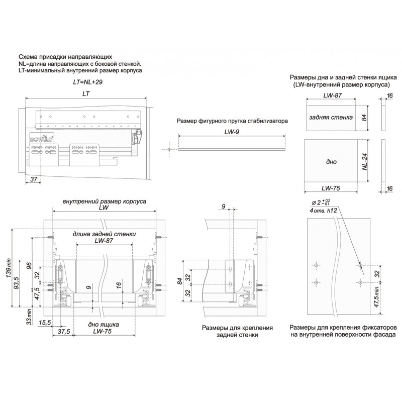 Для создания направляющих SWIMBOX «со стабилизатором» необходим комплект механизма стабилизации, в который входят: зубчатая рейка, 2 зубчатых колеса, 2 кронштейна, крепеж (саморезы), пруток стабилизатора длиной 1100 мм (подрезается в зависимости от ширины ящика).