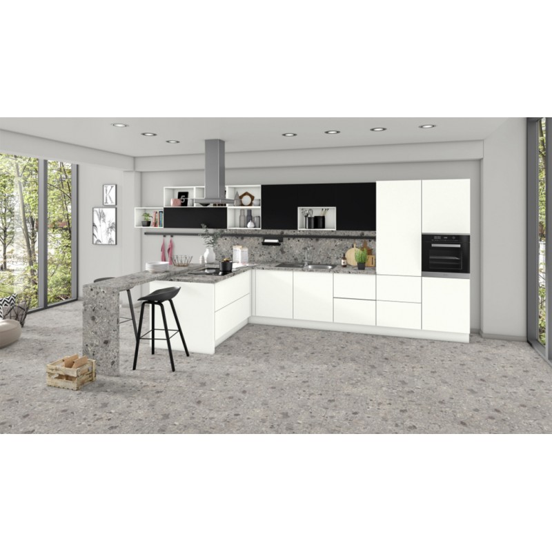 Имитации терраццо в качестве ретро-элементов снова используются в дизайне интерьеров. Терраццо Триест серый – это выразительный декор с несколько бóльшим масштабом рисунка, который за счёт своих серых оттенков очень хорошо подходит к поверхностям как в актуальных серых однотонных декорах, так и к древесным репродукциям, таким как Орех или светлый Каштан. Структура ST75 Минеральный сатин придаёт декору на ощупь бархатистость, а на вид естественную неравномерность рельефа.